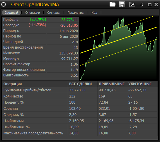 UpAndDown стратегия. Отчет торговли на графике GAZP (M5), 15000 баров истории