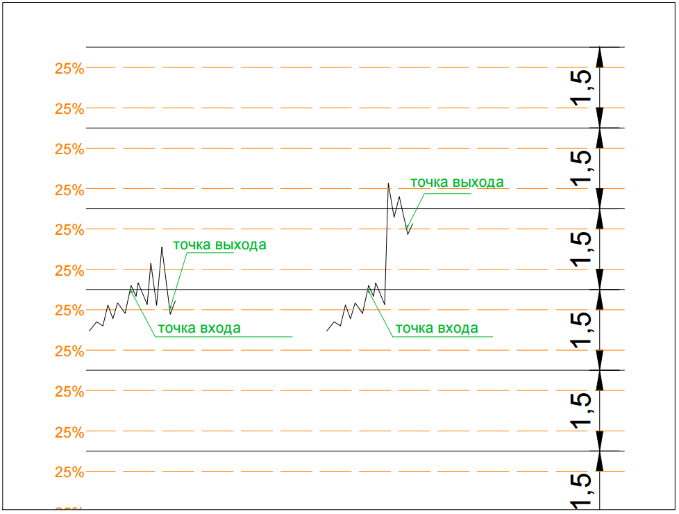 Когда у каждой линии есть имя - то проще прописать условие (только их будет много) - т.е. если цена больше линии А но меньше линии В (предыдущее значение цены менее линии А) - то осуществляем вход и так для каждой линии. Как выход прописать - не могу логарифмировать данный момент - нужно ведь сначала пробить следующую линию - а потом вернуться и выйти при проходе линии - 25%
