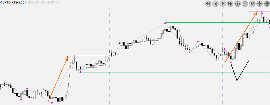 EMA с заданием типа и цвета линии возрастающей и понижающейся тенденции