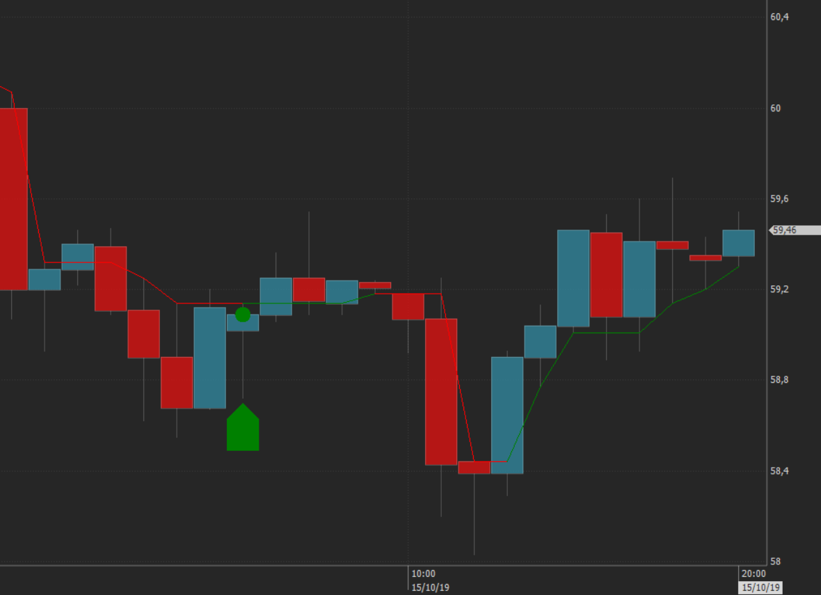 Пример отображения индикатора SuperTrend при параметрах PeriodATR = 5, PeriodCCI = 100, K = 1