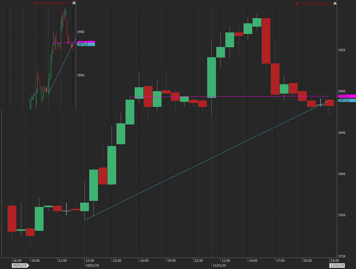 6. Луч или линию тренда неудобно привязывать. В некоторых терминалах свободный конец луча или линии тренда можно привязать (примагнитить) к значению O, H, L, C какого-либо бара.