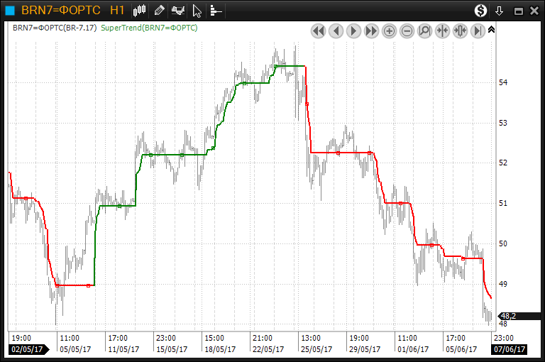 Пример отображения индикатора SuperTrend при параметрах PeriodATR = 50, PeriodCCI = 100, K = 3