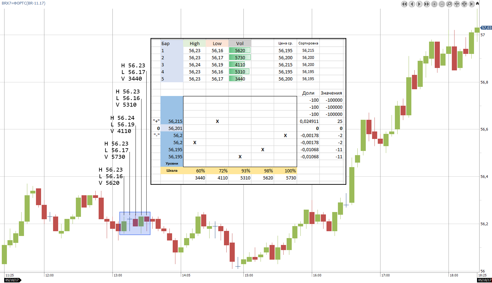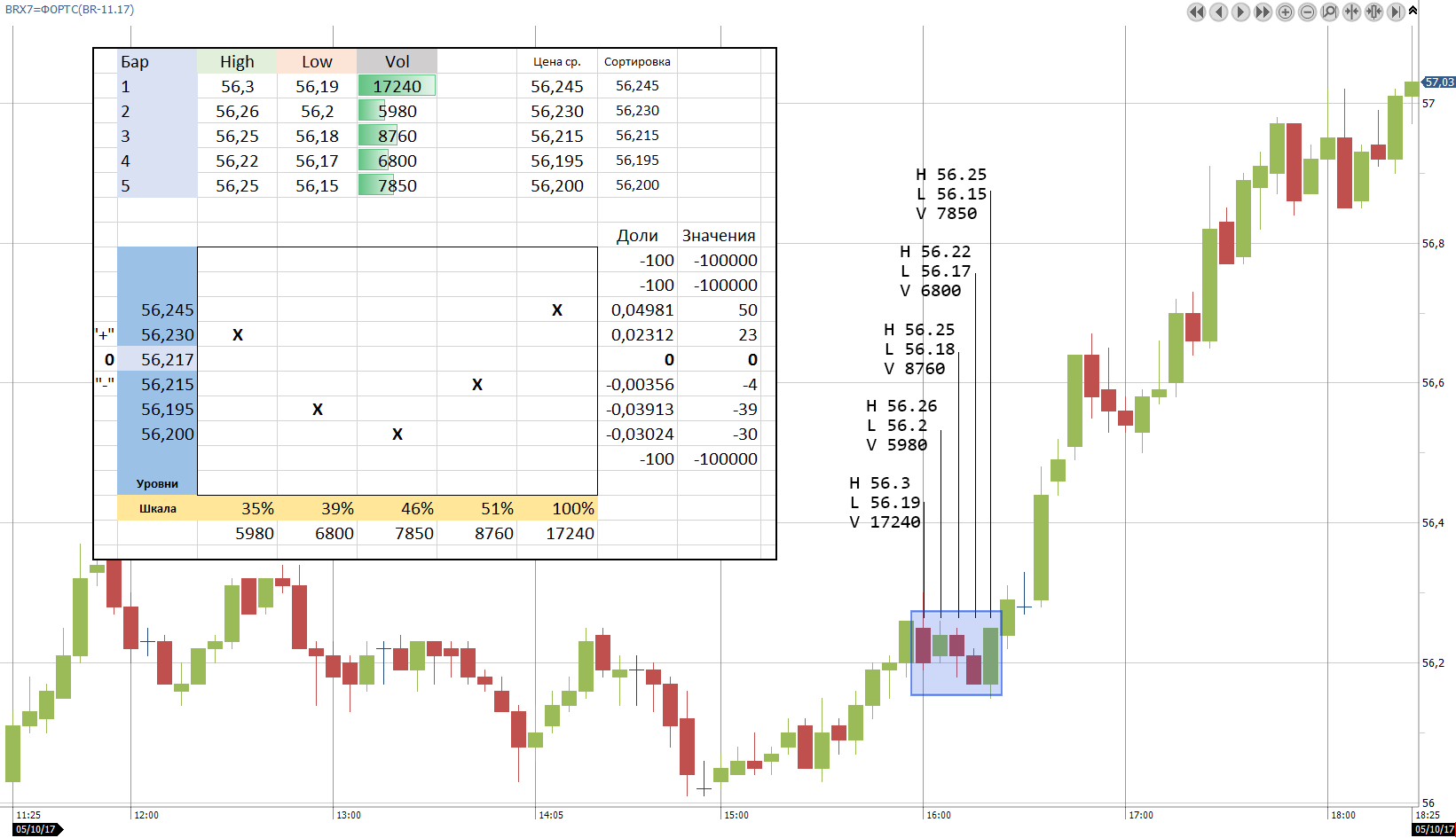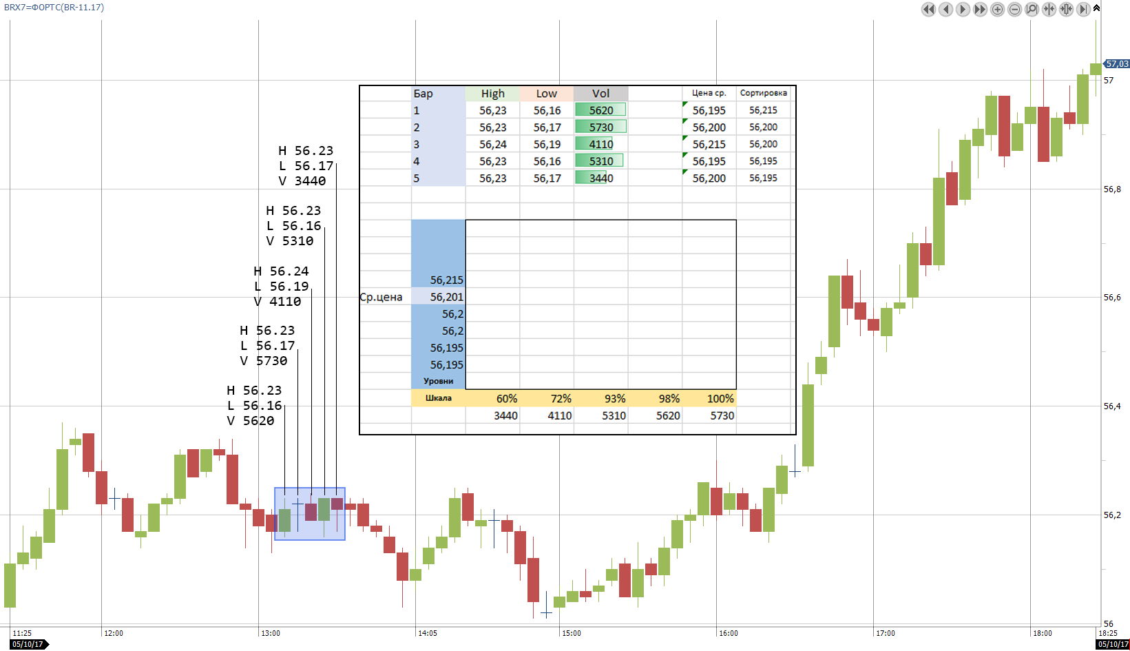 2. С каждого бара нас интересует средняя цена на основе high и low, а также объем того же бара (рис 2)