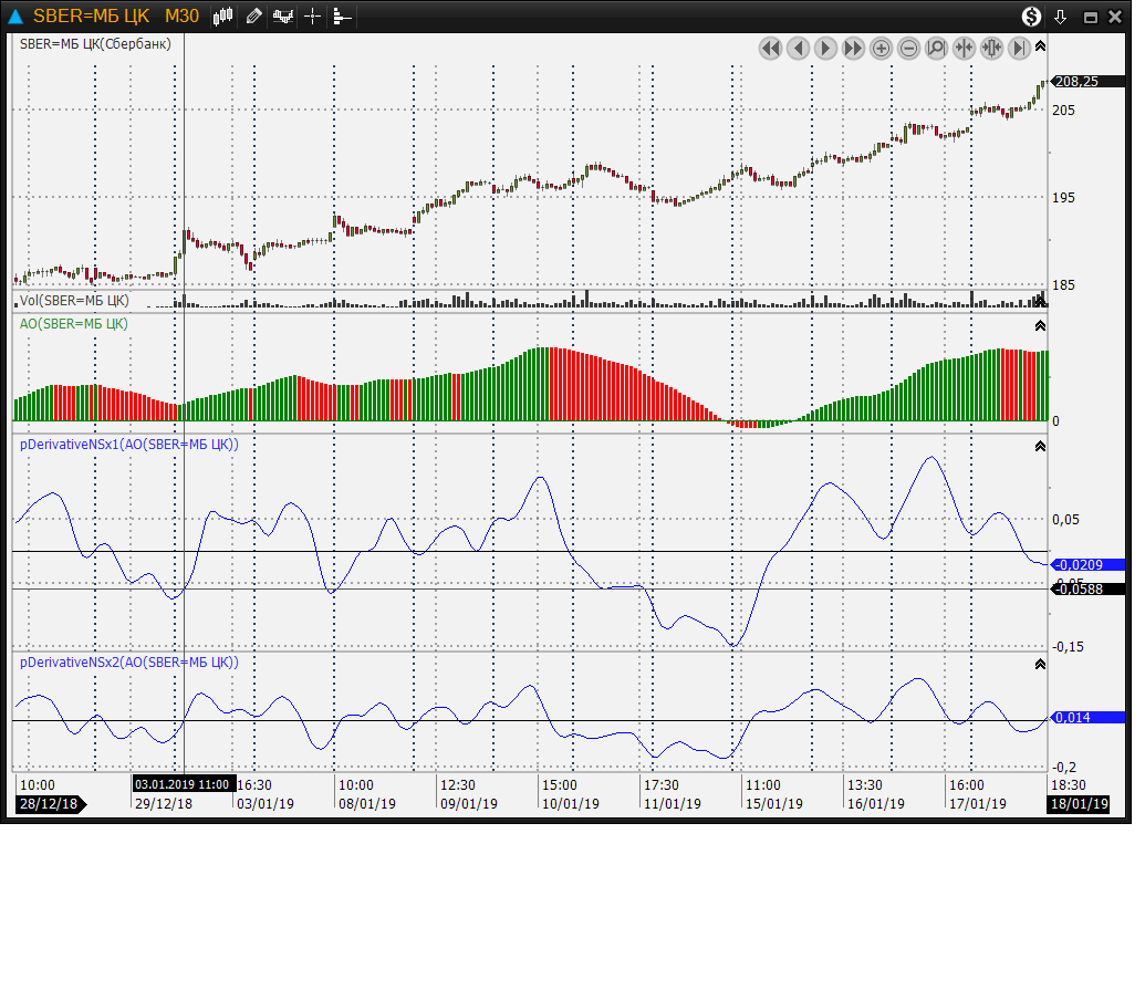 В приведенном примере индикатор AO (осциллятор awesome) раскрашивается просто по разности соседних значений. А можно было бы раскрасить по вычисленному значению производной. Заявленное отсутствие запаздывания, конечно, идеализация, но небесполезная.