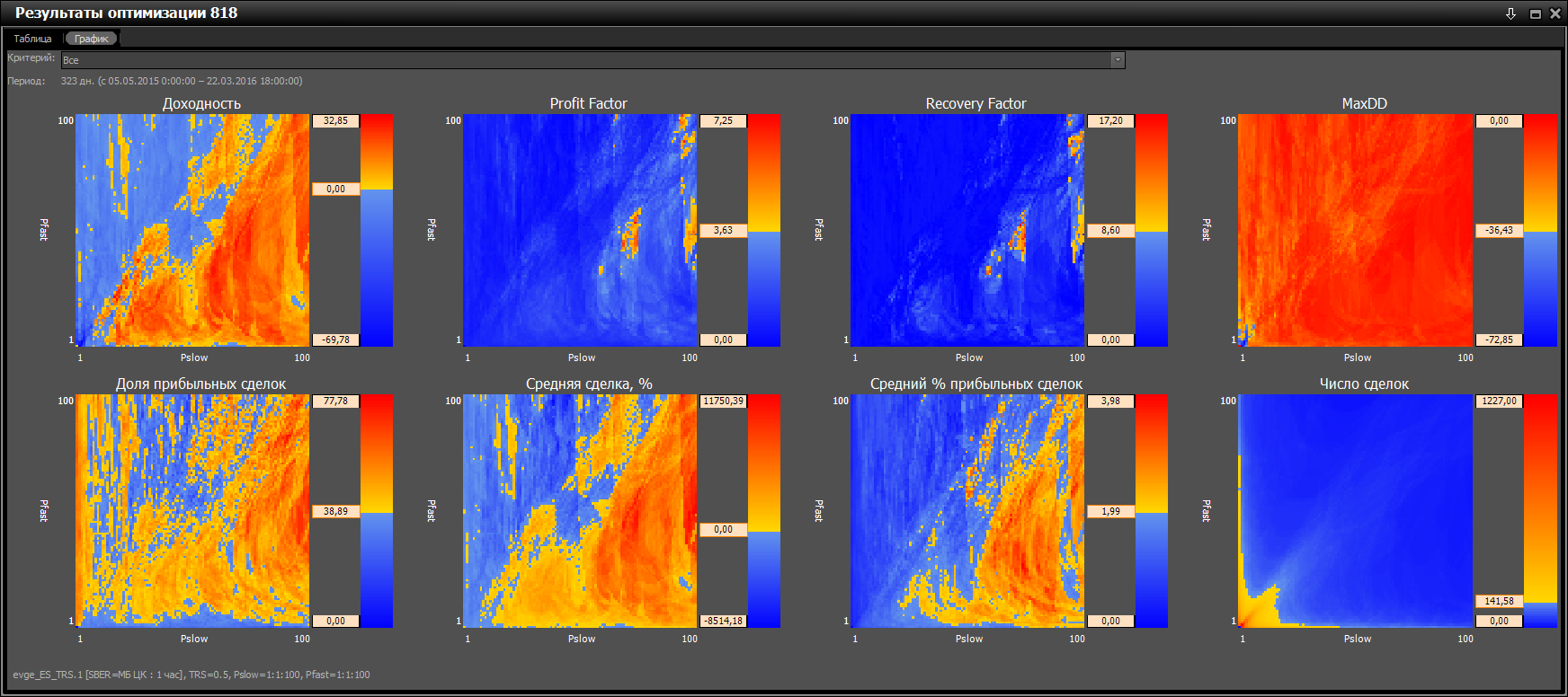 SBER, ТФ=1H. Все тепловые карты при оптимизации параметров Pslow, Pfast от 1 до 100 с шагом 1, при TRS = 0.5