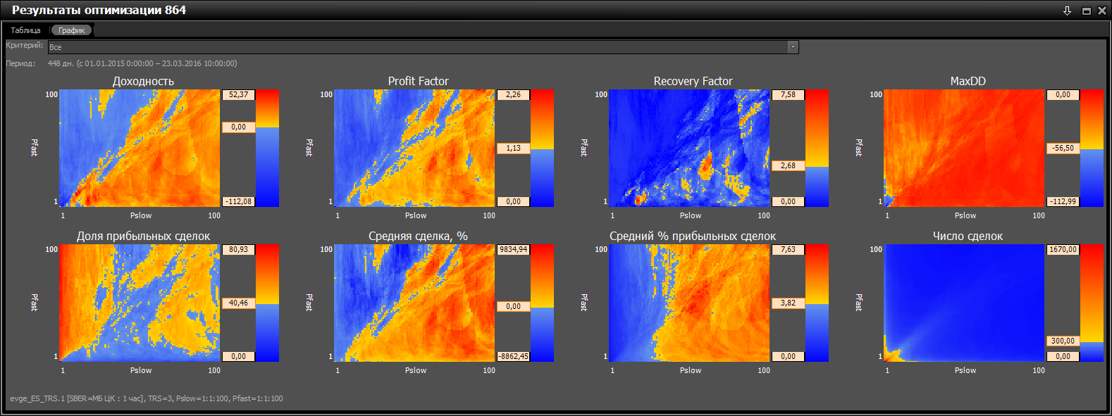 SBER 1H. Оптимизация Pfast, Pslow от 1 до 100 с шагом 1, TRS=0.5, с 01.01.2015 по 23.03.2016