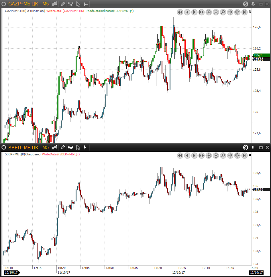 2. На каждом графике открыть по одному индикатору (разному!!!) пишущему данные графика в файлы. Это два индикатора WriteData1 и WriteData2