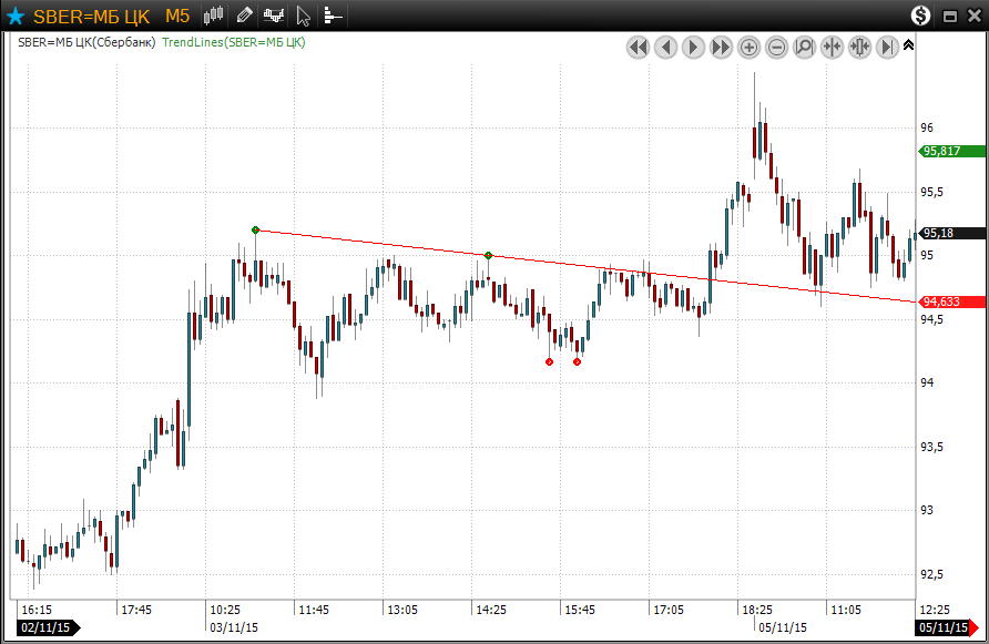 Между двумя последними понижающимися максимумами и двумя последними повышающимися минимумами, если таковые имеются, рисуется трендовая линия до текущего бара.