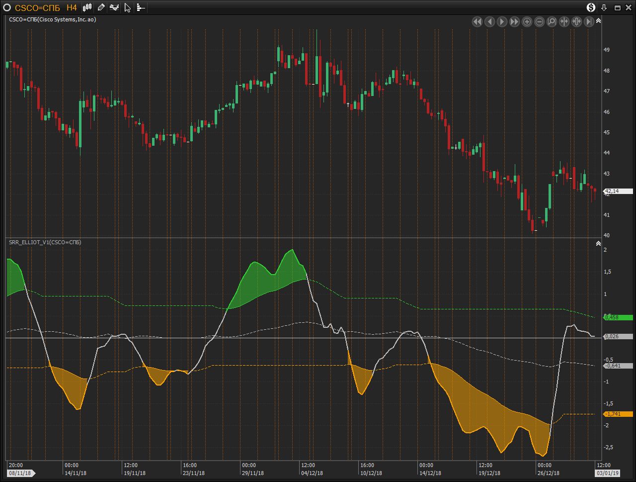 Линии уровней - нестандартные. Они вычисляются с использованием ЕМА на основе прерванных временных рядов. Средняя линия вычисляется как среднее между двумя внешними уровнями. Такой тип средней "нулевой" линии дает более ранние сигналы, чем обычное пересечение нулевой линии.