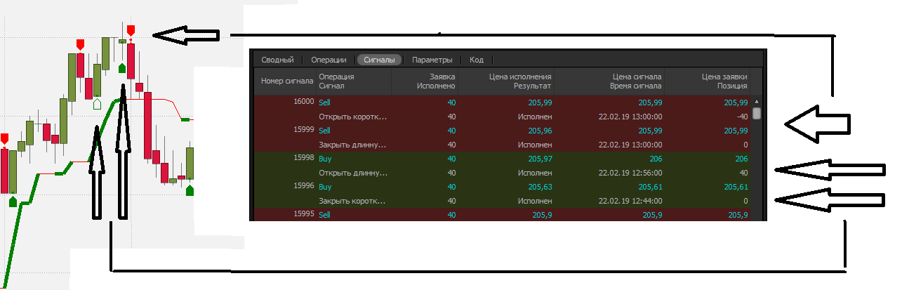 По идее на выходном графике я должен видеть только "сплошные" стрелки (перевороты), но часто вижу "пустые" (закрытие позиции), а открытие - через несколько баров. Вот пример: