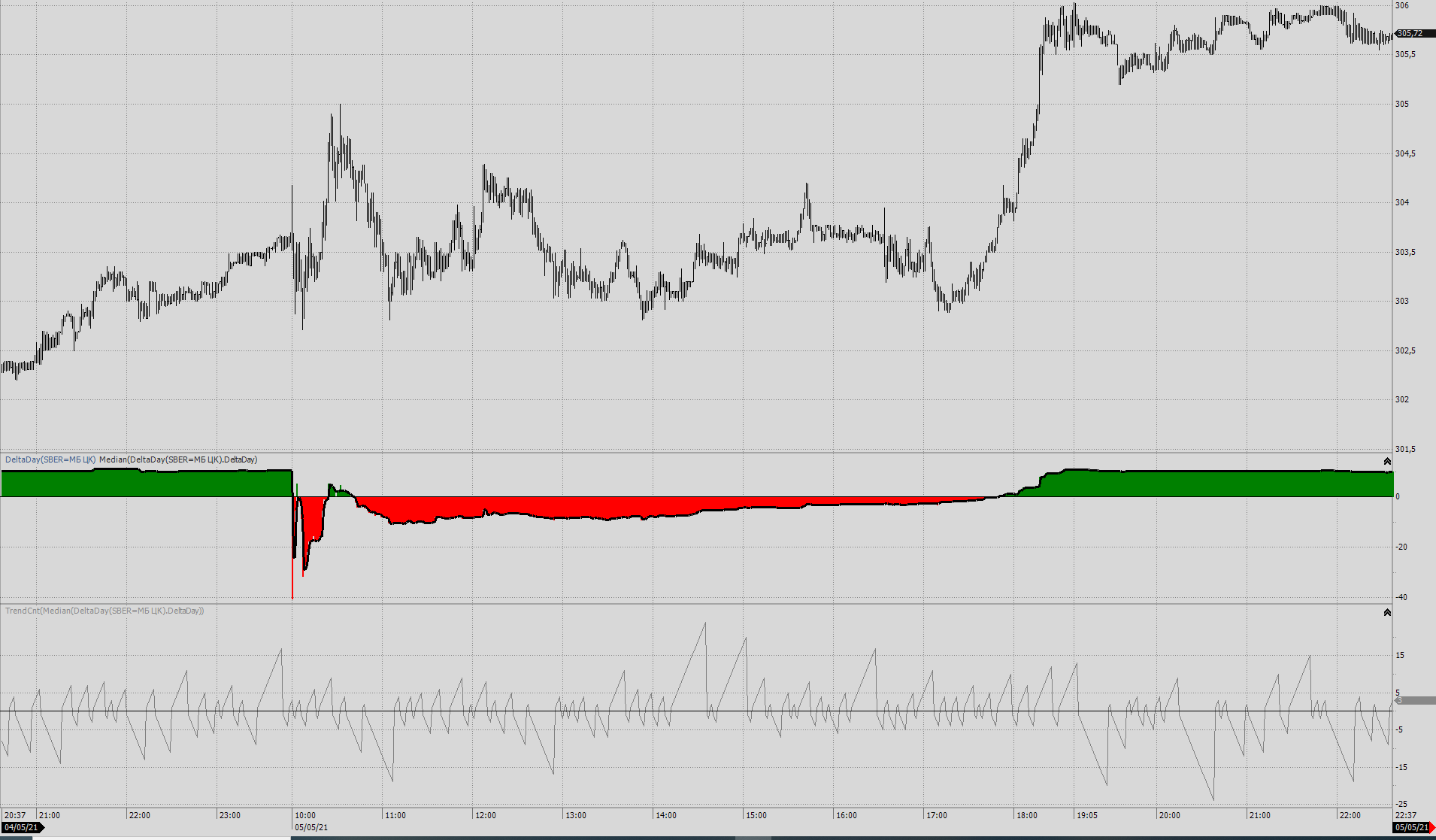 Еще пример, чисто смена знака счетчика тренда. Источник данных счетчика - медианное значение (в окне 3 бара) от кривой накапливаемой от начала дня разницы между Ask и Bid (в процентах).